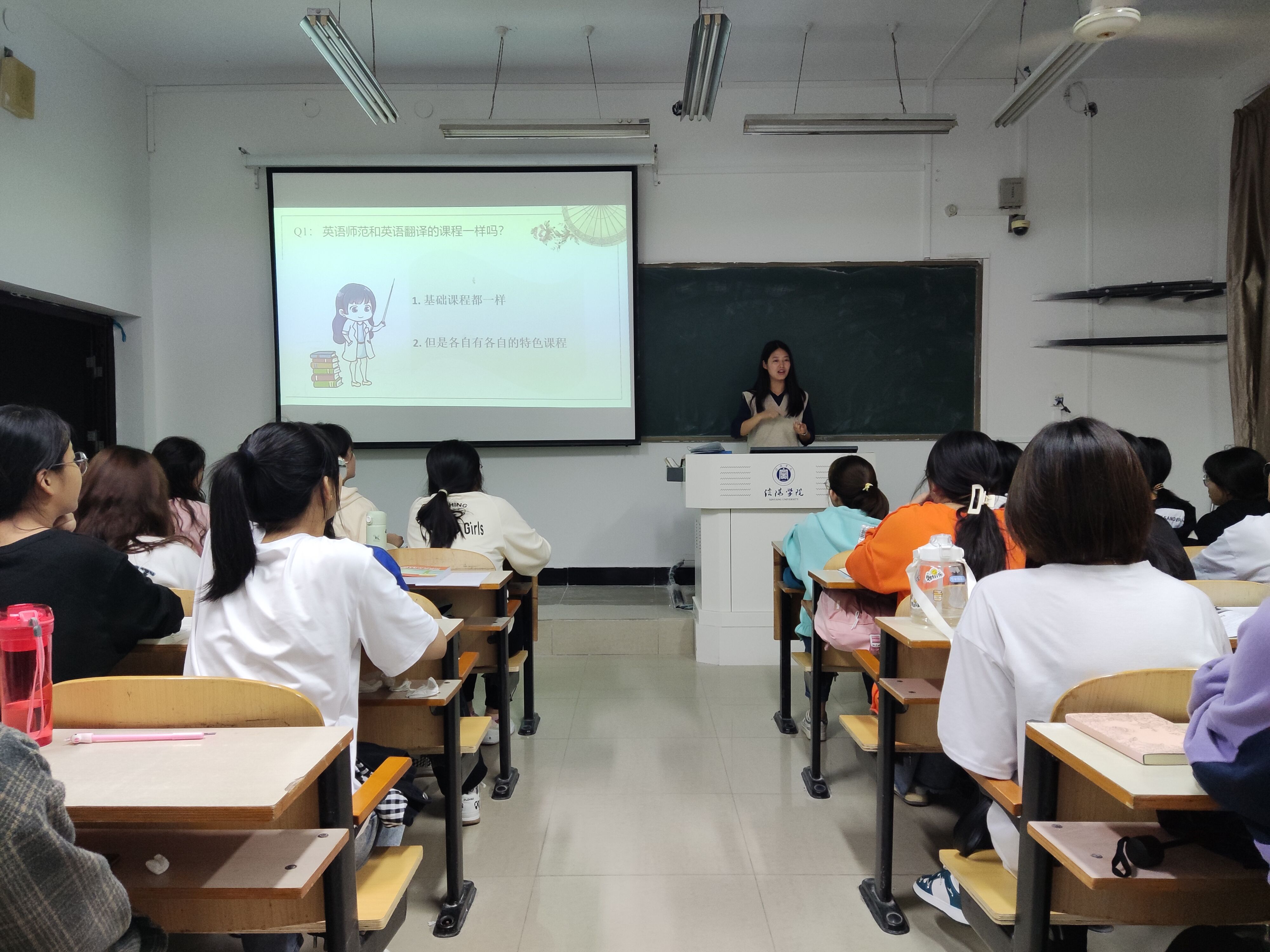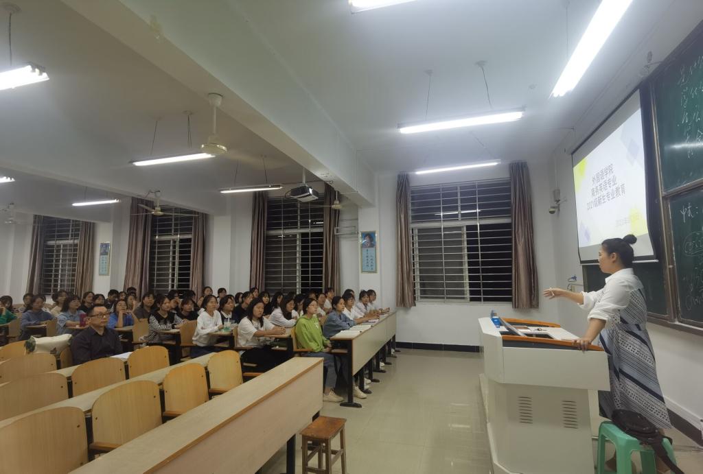 相关专业教师陈俊明、彭然、许超和王晓丽四位老师向同学们介绍了英语翻译专业和商务英语专业的情况和毕业后就业的前景;教导同学们要合理地安排课外生活和学习,做到既充实生活又能学到知识;鼓励同学们在学习之余还要多多了解一些课外知识,尽量做到生活中各方面都通,中英文翻译能力各方面都要精。另外,相关专业老师还谈到在学习中每个学生都应该拥有自己的目标,要明确自己的志向并为之努力。在互动提问环节,专业老师对新生提出的问题进行逐一详细解答。
