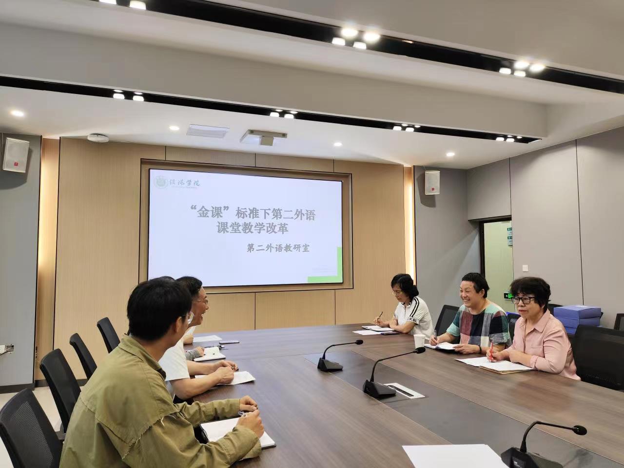 随后,教研室其他参会教师踊跃发言,积极探讨“金课”标准下第二外语课堂教学现状和教学改革关键点。就如何在“金课”标准下进行第二外语课堂教学改革,教研室老师认为可以从课程、教师、考核等多个层面进行研究。一、体现“金课”标准下的金课程,在教学改革中,教师要关联人才培养计划,适应学生学习和成长的需求;二、体现“金课”标准下的金教师,教师在开展教学指导活动时要树立学生科研意识,提高学生学习的主观能动性;三、体现“金课”标准下的金教材,第二外语课程应合理挑选教材;四、体现“金课”标准下的金课堂,教师要把学习主动权交给学生,动态指引学生分析知识和掌握知识。