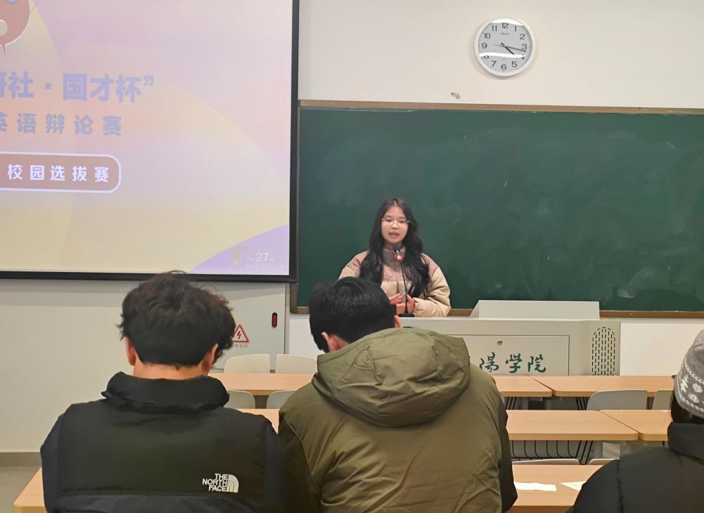 为全方位提高英语口语表达能力、思辨能力、跨文化交际能力、就业竞争力、国际传播力、全球胜任力,为广大英语爱好者精心构筑展示自我风采的优质平台,2025年3月4日,ok138cn太阳集团529悉心筹备的第二十七届国才杯英语辩论赛校选赛初赛(暨太阳集团第九届英语辩论赛)在教二楼410教室圆满落下帷幕。本次比赛由青年教师董文静和余静全程指导,学院学术部精心组织,评委团由国才考试证书持有者和太阳集团第八届英语辩论赛优秀辩手(潘苏格、刘晶茹)、“国才杯”全国大学生外语能力大赛省级国家级获奖者(马靖然、沈晓宇)和往届国际青年文化交流项目优秀双语助教(李雨函、侯利伟)组成。