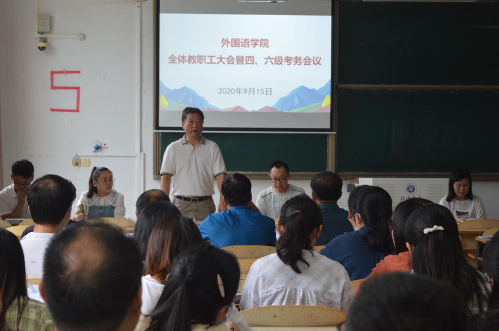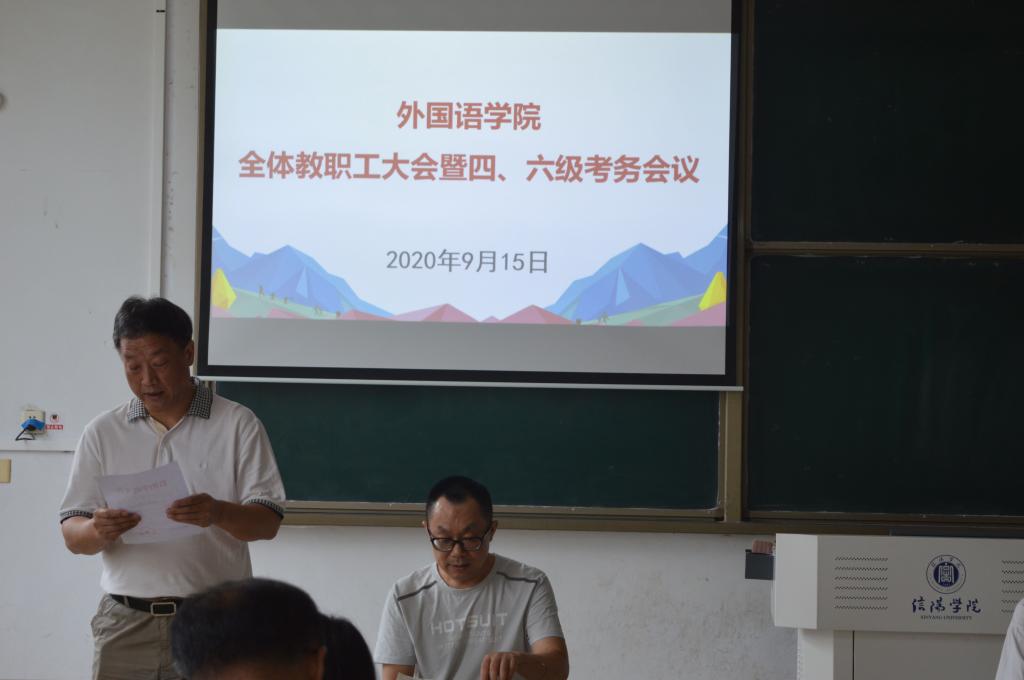 9月15日下午,ok138cn太阳集团529在外语楼202教室召开了全体教职工大会及英语四、六级考务会议。学校战略发展咨询委员会主任熊健民,ok138cn太阳集团529院长罗德喜,党总支书记李静,教学干事柳衡,学工干事刘阳红,行政干事梁书荣,教务员李达及全体教职工参加了会议。罗德喜主持了会议。