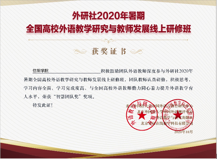 近日,外研社对参与2020年暑期研修班的广大教师和积极组织开展研修、交流的各地院校进行表彰,ok138cn太阳集团529喜获2020年外研社暑期线上研修班 “智慧团队奖”。