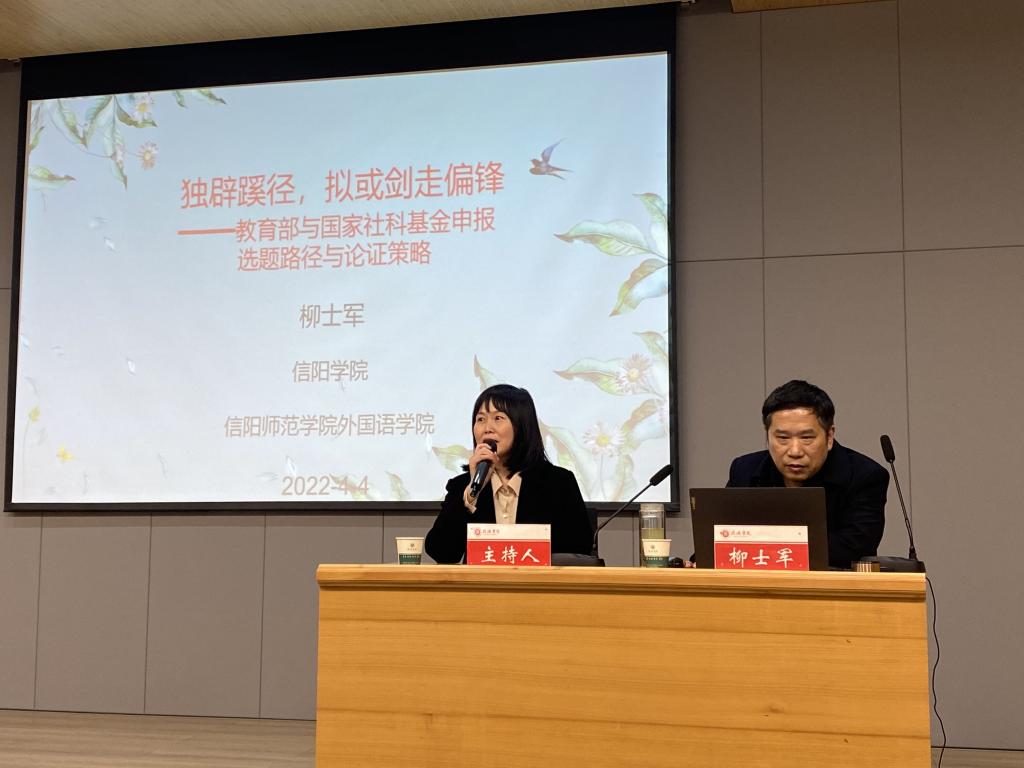 4月4日下午,应我校ok138cn太阳集团529邀请,信阳师范学院柳士军博士在图书馆101报告厅作了题为“独辟蹊径与剑走偏锋——教育部与国家社科基金的选题论证与申报撰写”的学术报告。ok138cn太阳集团529党总支书记程娇炎、教学副院长李静和学院全体教师共同聆听了报告。李静主持了报告会。