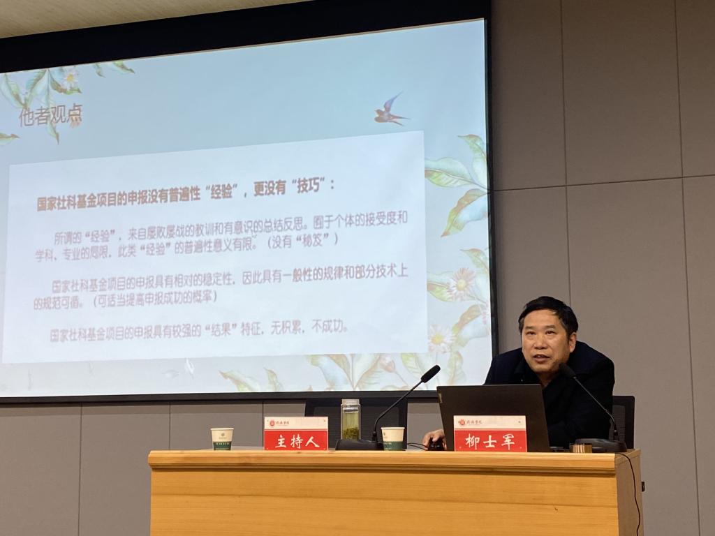 柳士军从个人发展的需要、学院发展的需要、学校发展的需要和国家发展的需要四个方面,阐述了教育部和国家社科基金申报的重要性。他结合自己申报教育部和国家社科基金的经历,向老师们分享了心得和经验,鼓励全体师生要广泛听取各种学术讲座以激起学术研究的兴趣,以积极的心态做项目,充分做好项目的前期积累工作。依据近年来国家社科申报指南和部分立项题目,详细分析了选题的热点和方向,以及教育部和国家社科选题的不同点。叮嘱老师们认真研究项目申报指南,项目的选题要满足国家和社会发展需要,要体现中国视角。项目的立项不是一蹴而就的,需要长期坚持多听讲座、多写项目、多向专家请教,是知识、德行和机遇共同作用的结果,需要锲而不舍地追求。
