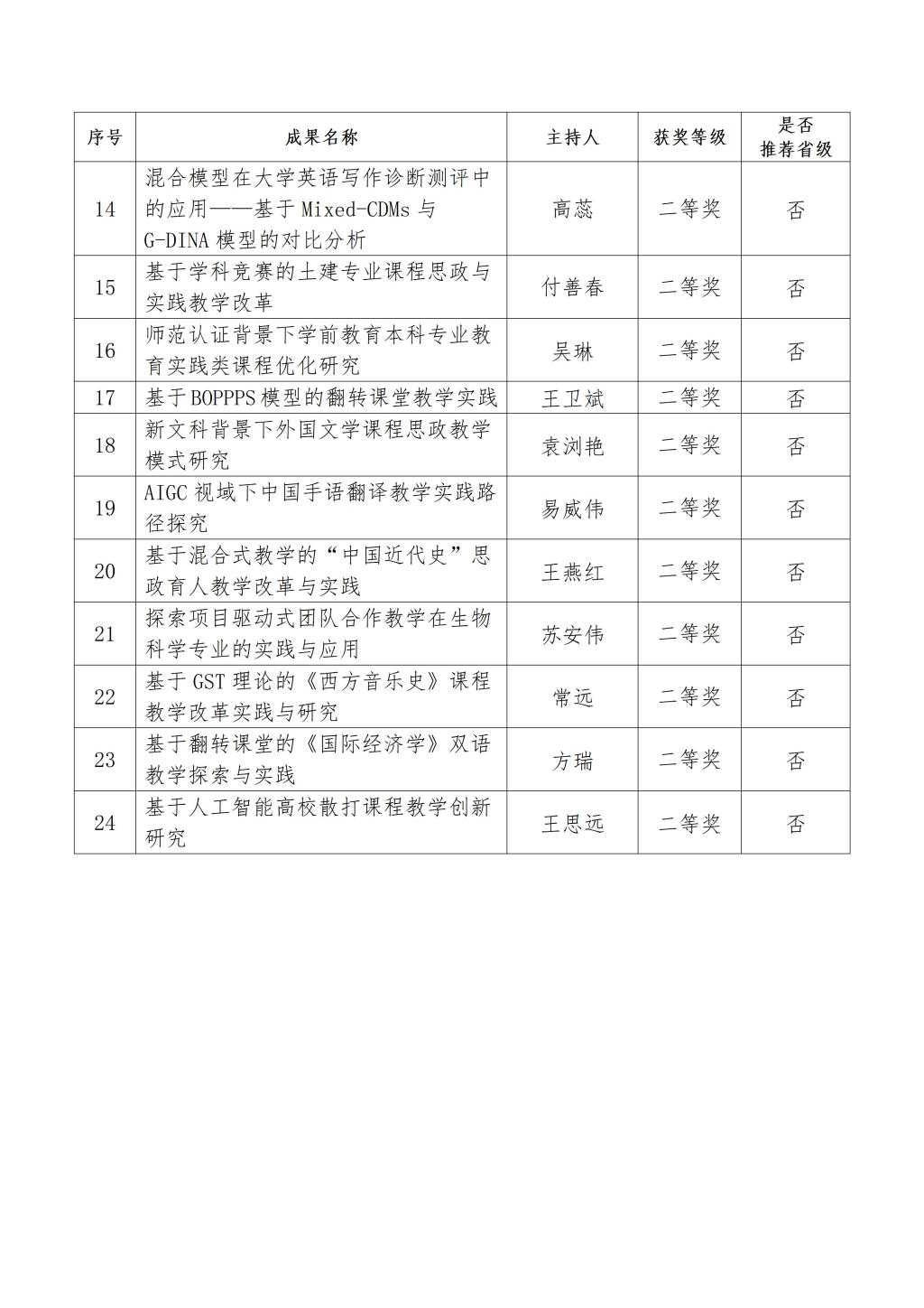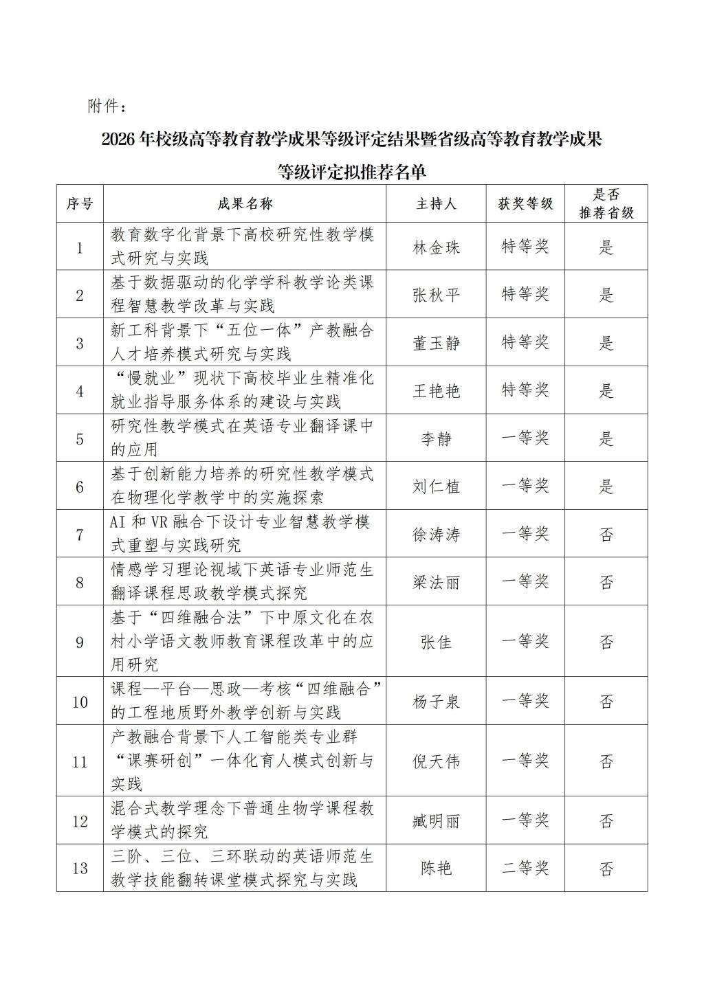 经个人申请、单位推荐和专家评审,共评选出2026年校级高等教育教学成果奖24项,其中,特等奖4项,一等奖8项,二等奖12项。同时,根据评审结果和推荐名额,拟推荐林金珠副教授主持的“教育数字化背景下高校研究性教学模式研究与实践”等6项成果参加2026年河南省高等教育教学成果等级评定。现将结果予以公示。