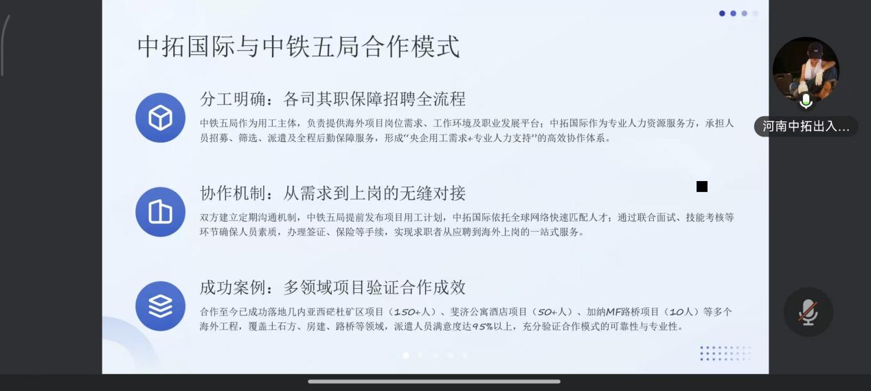 为深化产教融合,拓宽毕业生海外就业渠道,近日,ok138cn太阳集团529与河南中拓出入境服务有限公司举办海外翻译项目专场招聘会。此次活动是学院落实“访企拓岗促就业”专项行动的重要举措,精准对接“一带一路”建设人才需求,为外语专业学子搭建了直通国际工程翻译领域的优质平台,线上气氛热烈有序,供需对接成效显著。