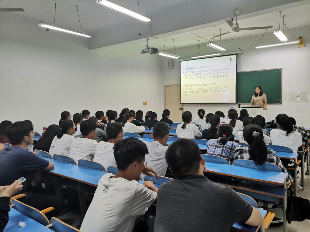 主讲人黄老师主要从学科建设、师资力量、教学资源、科研实力、人才培养和就业前景等方面对翻译专业进行了全面详细的介绍,让同学们对翻译专业有了进一步的深入了解。黄老师指出在大学四年中,很多同学可能会对学习和生活感到迷茫,希望同学们坚定自己的目标,不忘初心,能够在专业知识中多钻研,真正做到“术业有专攻”。接着,黄金金老师讲述了翻译专业的优势,帮助学生确立大学四年的学习规划,要求学生自尊自爱自立自强,成就更好的自己。