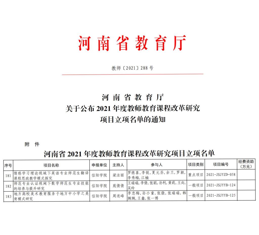 近日,河南省教育厅发布《关于公布2021年度教师教育课程改革研究项目立项名单的通知》(教师〔2021〕288号),我校获批3项2021年度河南省教师教育课程改革研究项目立项。