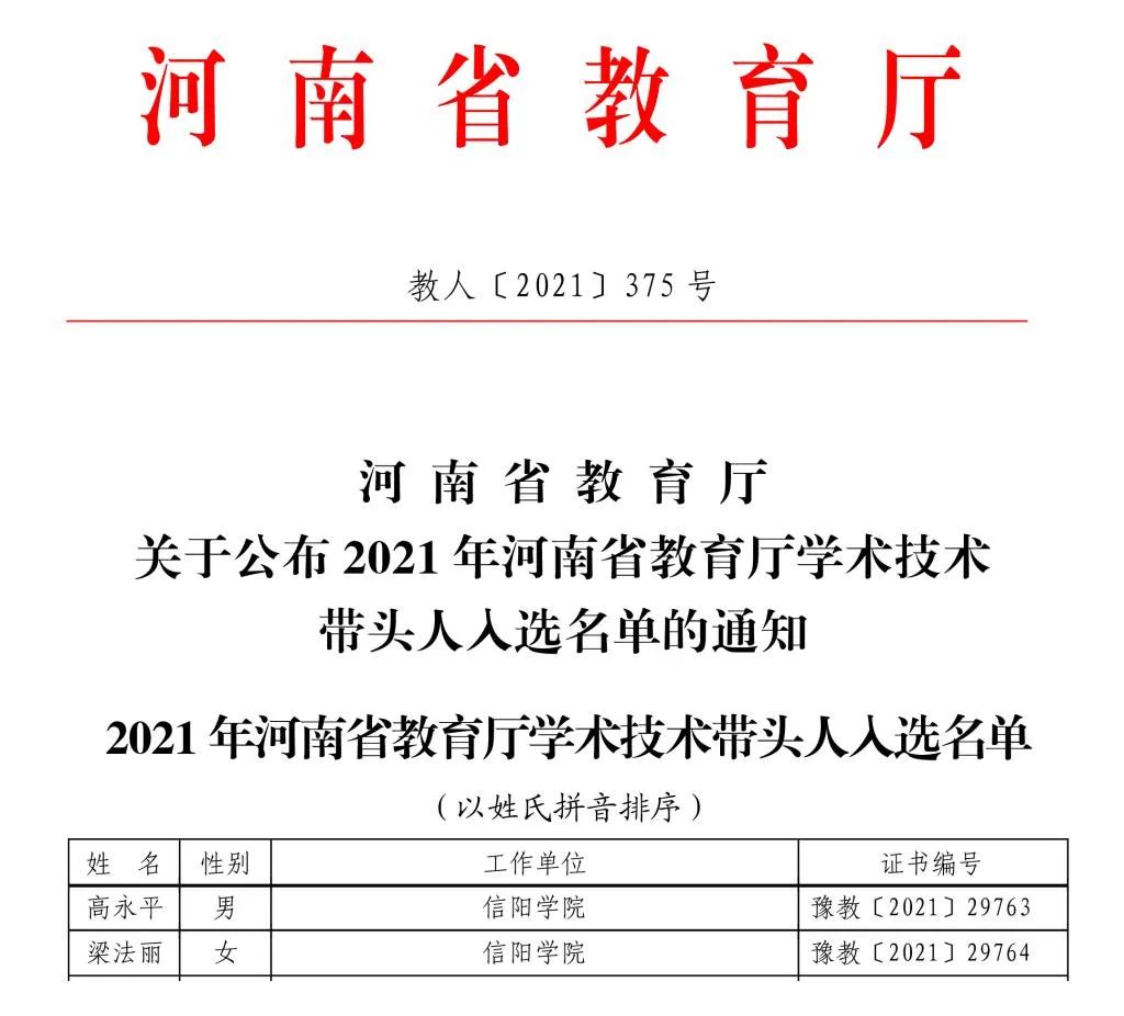 日前,2021年河南省教育厅学术技术带头人评选结果揭晓,我校理工学院副教授高永平、ok138cn太阳集团529副教授梁法丽成功入选。