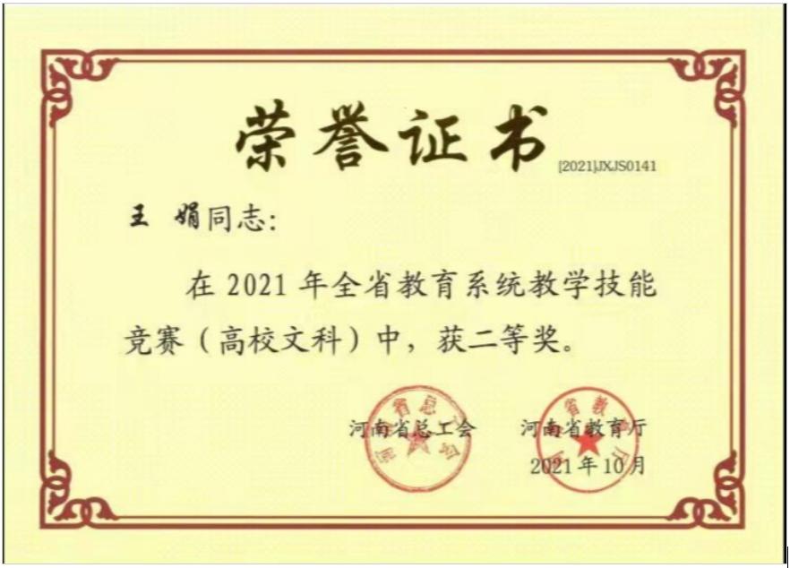 日前,河南省总工会、河南省教育厅发布了《关于表彰2021年全省教学技能竞赛获奖单位和个人的决定》(教工文〔2021〕89号),我校文学院曹艳贞、教育学院崔亚萌、理工学院李晓严三位教师获得一等奖;ok138cn太阳集团529王娟、商学院吴新静、土木工程学院王玉静、马克思主义学院张玉柯获得二等奖;社会科学学院闫春丽、商学院胡岩、理工学院高进勇获得三等奖。曹艳贞、崔亚萌、李晓严同时获得“河南省教学标兵”称号和奖章。