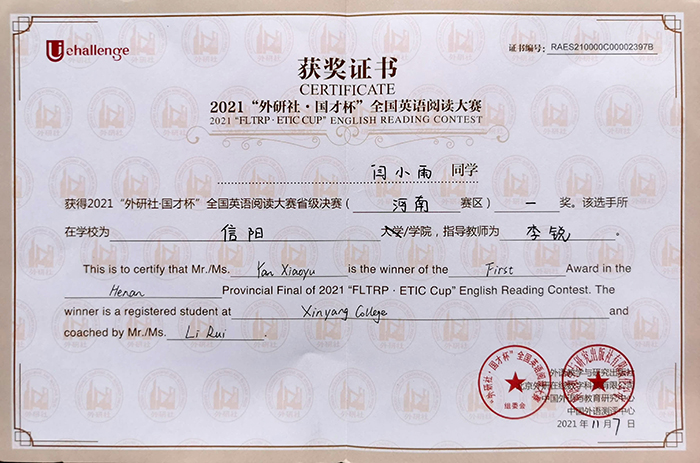 近日,2021“外研社·国才杯”全国英语演讲、阅读、写作大赛省级决赛(河南赛区)落下帷幕。来自全省各高校的400余名选手参加比赛。受疫情影响,本次比赛采取线上方式进行,参赛选手在本校指定考场,通过与评委视频连线进行线上答题、展示和答辩环节。