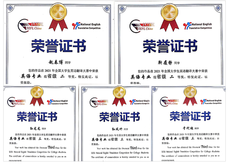日前,2021年全国大学生英语翻译竞赛成绩揭晓,我校ok138cn太阳集团5292019级英语本科6班杨晨获国家级三等奖,2019级英语本科6班靳履静、2019级英语本科7班赵春博获省级二等奖,2019级英语本科6班孙龙龙、于代迪和2019级英语本科7班孙风竹获省级三等奖,梁法丽老师获指导教师奖。