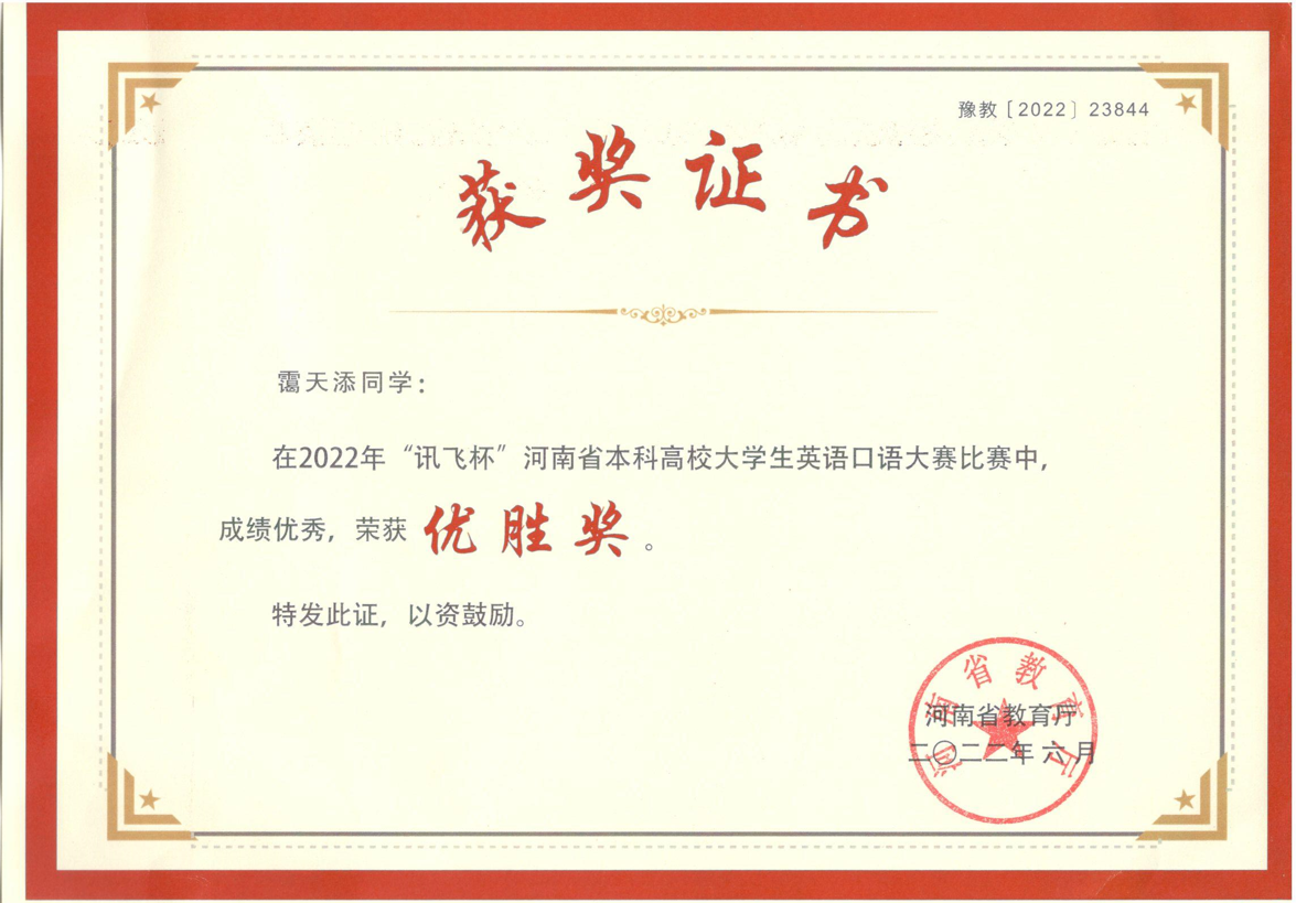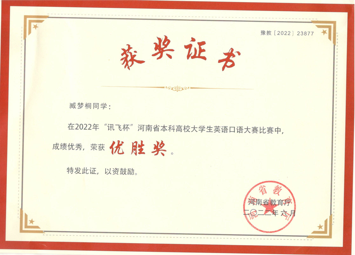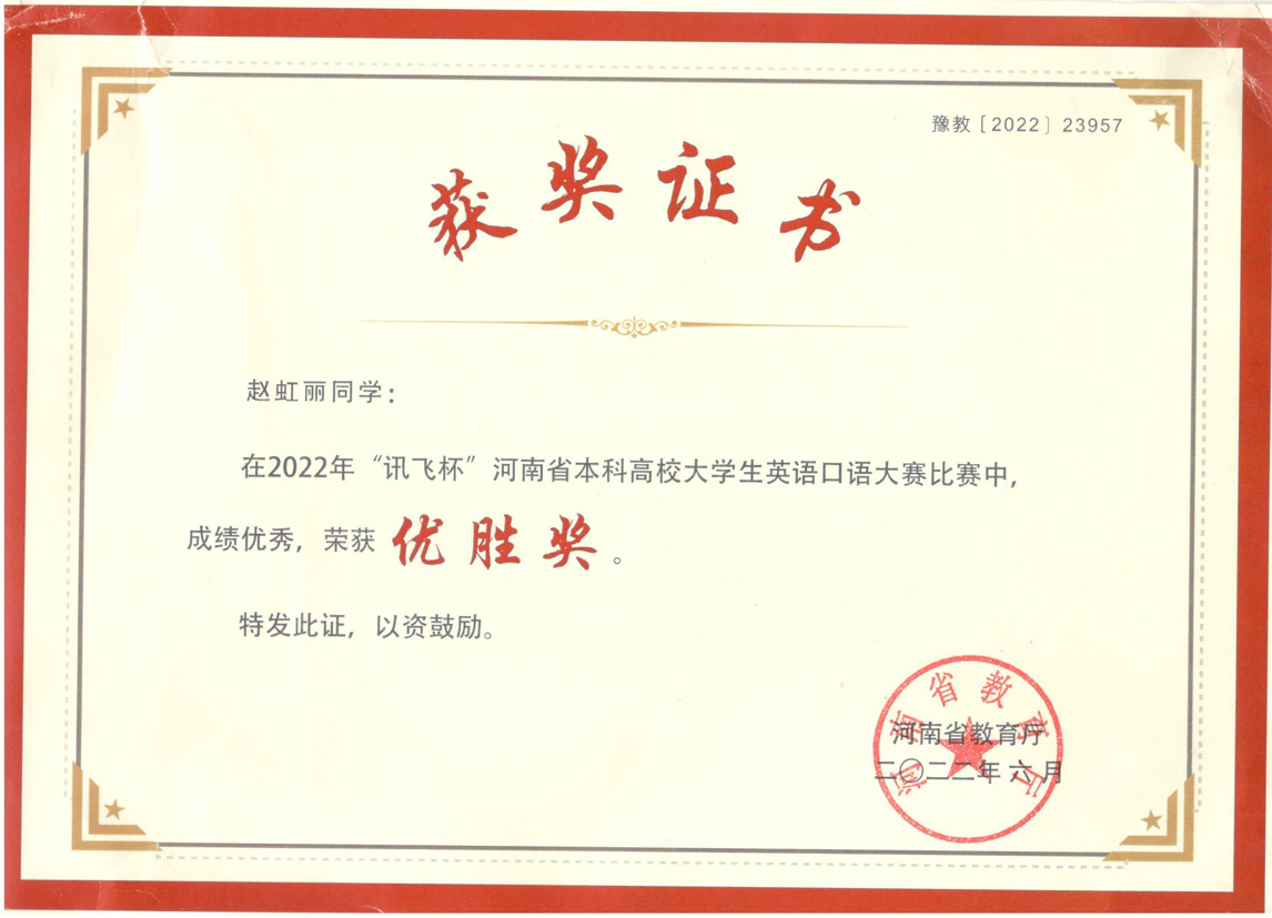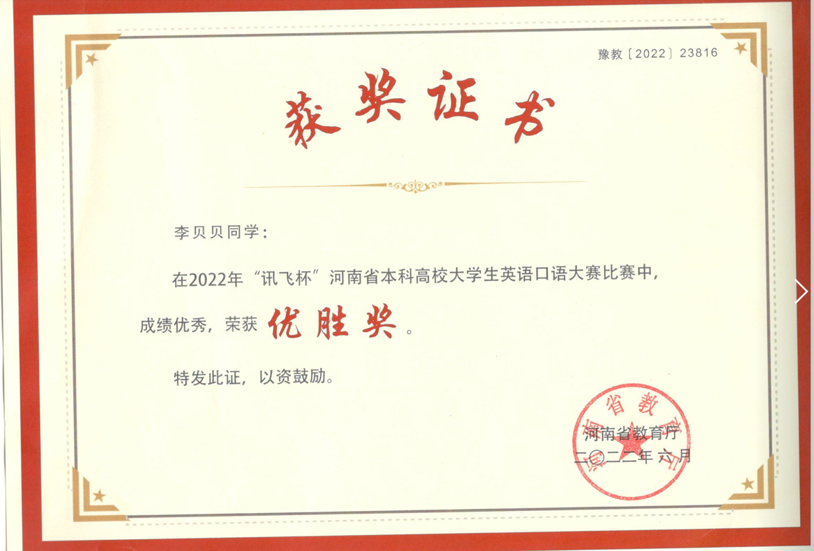 近日,由河南省教育厅主办的2022“讯飞杯”河南省本科高校大学生英语口语大赛落下帷幕。包括我校在内的来自河南省多所高校的约9万名在校大学生参加了此次比赛,经过激烈角逐,我校英语专业和汉语言文学专业李贝贝、臧梦桐、霭天添、张诗懿、赵虹丽等多位同学表现突出,均进入了复赛,并在省级复赛中获得优胜奖。