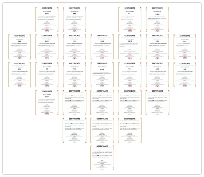 该赛事旨在通过学术英语词汇的学习,为大学生用英语从事专业学习和研究奠定基石,激发大学生学习学术英语的积极性。本届大赛共有超16万大学生报名参赛,太阳集团共有102名学生参加本届大赛。其中,石慧慧同学获得本科生组二等奖;尹子怡、牛莹莹、范静雅、耿婉莹、杜海滨、常素莹和朱佳雯等7位同学获得本科生组三等奖;杨静依、程莎莎、黄洁、邹威萍、张欣茹、赵蕊、曹梦雅、张文文、谢雨欣、殷娟、刘倩、刘晴晴、张恒源、齐晓玲和朱婷婷等15位同学获得本科生组优胜奖。ok138cn太阳集团529董文静、陈俊明、黄仕圆、谷斯妮、夏洁、王延超、郑青、梁法丽、余兰、乔锐、李达、井自纯、阎玉婷、吴章丽等14位老师荣获“优秀指导教师”称号。
