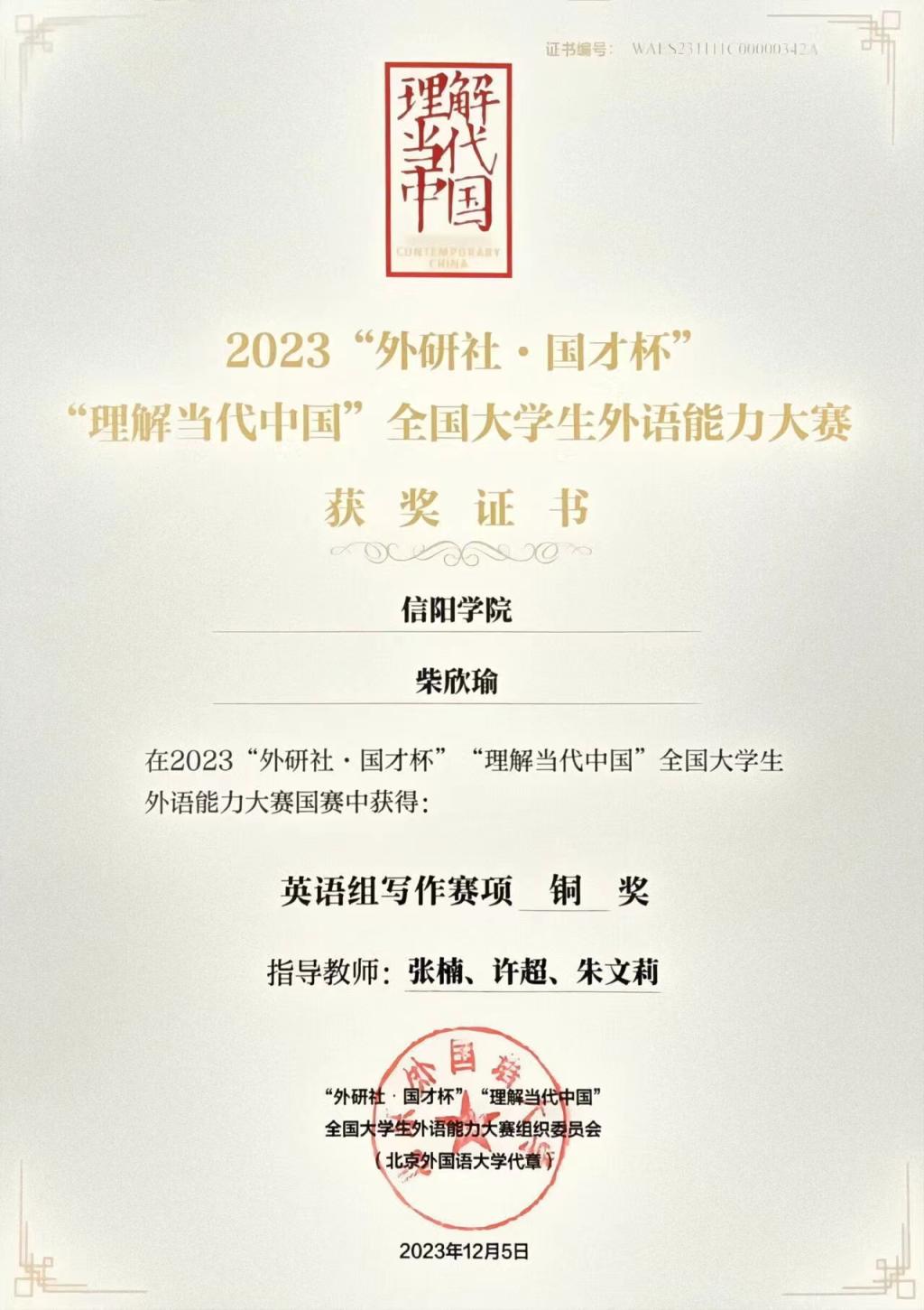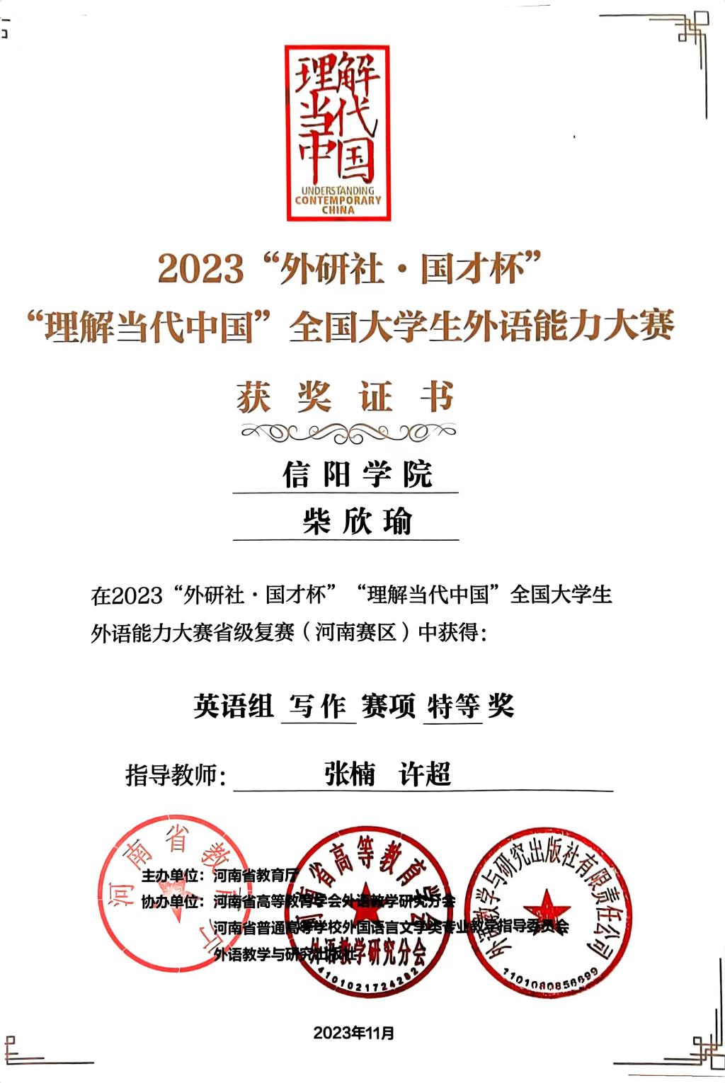 近日,我校ok138cn太阳集团529学生柴欣瑜在2023“外研社·国才杯理解当代中国”大学生外语能力大赛写作赛事中表现优异,斩获铜奖。年前12月,柴欣瑜在2023“外研社·国才杯理解当代中国”全国大学生外语能力大赛(河南赛区)中荣获特等奖并顺利晋级国赛。