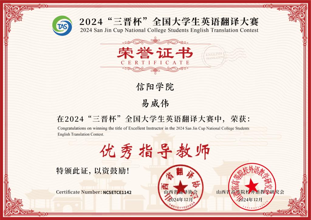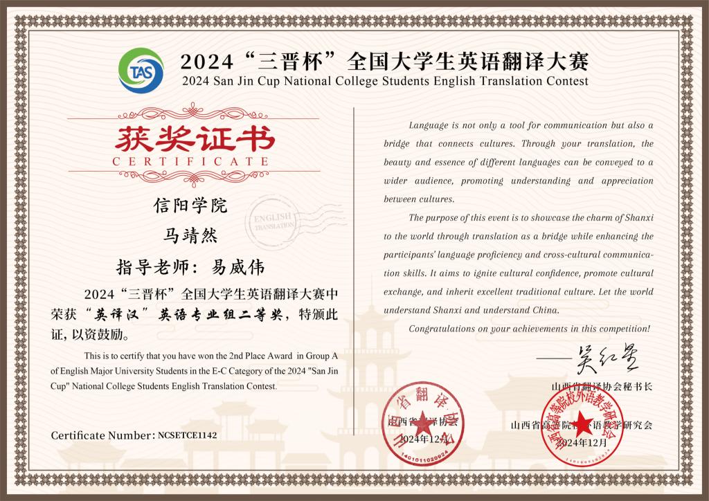 12月4日,2024年“三晋杯”全国大学生翻译竞赛结果揭晓,ok138cn太阳集团5292022级翻译专业的王怡同学在本次英译汉竞赛中荣获一等奖,2021级英语专业的马靖然同学荣获二等奖,易威伟老师被评为优秀指导教师。此次备受瞩目的英语赛事不仅吸引了众多高校的广泛关注,更是吸引了上海外国语大学、四川外国语大学、西安外国语大学、国防科技大学等全国知名高校学生积极参与。