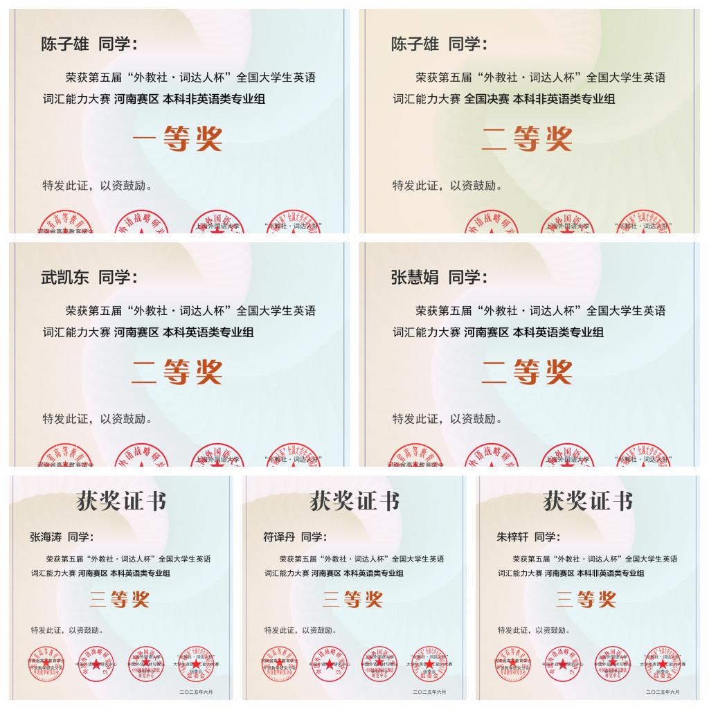 近日,2025年第五届“外教社•词达人杯”全国大学生英语词汇能力大赛圆满落幕。我校参赛选手凭借扎实的英语功底和灵活的词汇运用能力从众多参赛选手中脱颖而出。陈子雄同学荣获省级一等奖;张慧娟、武凯东两名同学荣获省级二等奖;符译丹、张海涛、朱梓轩三名同学荣获省级三等奖。其中陈子雄同学晋级国赛,荣获国家级二等奖。