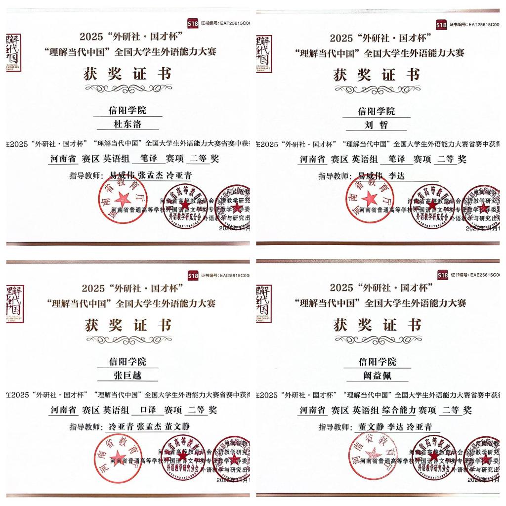 本次大赛由河南省教育厅主办,河南省高等教育学会外语教学研究分会、河南省普通高等学校外国语言文学类专业教学指导委员会和外语教学与研究出版社协办。大赛以“理解中国,沟通世界”为主题,以习近平新时代中国特色社会主义思想为指导,深入贯彻党的二十大精神,紧扣立德树人根本任务,推动课程思政与外语教学深度融合。赛事涵盖演讲、综合能力、笔译、口译、短视频五大赛项,为青年学子搭建了展示外语应用能力、阐释中国发展实践的优质平台。比赛中,我校参赛学子从容应战,用流利外语讲好中国故事,以深刻认知诠释青年担当,充分展现了新时代大学生的全球视野与综合素养。