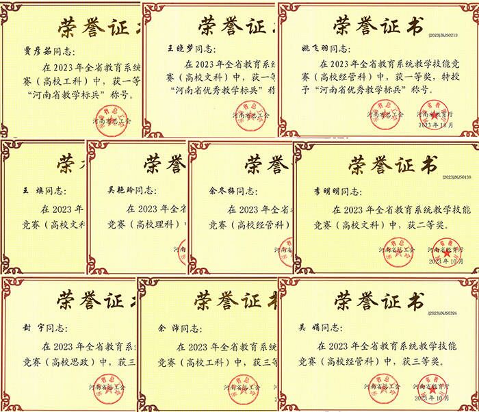 近日,河南省总工会与河南省教育厅联合发布了《关于2023年河南省教学技能竞赛获奖情况的通报》(豫工文〔2023〕107号),对在全省教学技能竞赛中取得优异成绩的集体和个人进行了表彰。经过激烈角逐,我校10名教师凭借出色的教学技能斩获多个奖项,为学校赢得了荣誉。其中,一等奖3项,二等奖4项,三等奖3项。王晓梦等2名教师被授予“河南省优秀教学标兵”荣誉称号,1名教师被授予“河南省教学标兵”荣誉称号。