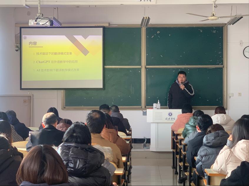 会议伊始,许超老师给大家讲述《在面对大数据人工智能的时代背景下提出技术驱动下翻译模式的变革》,他首先提到ChatGPT在外语教学中的应用以及AI技术影响下翻译教学模式改革,形象地展示现代技术在翻译领域的魅力,凸显现代科技创新发展对翻译教学方面产生深远影响。