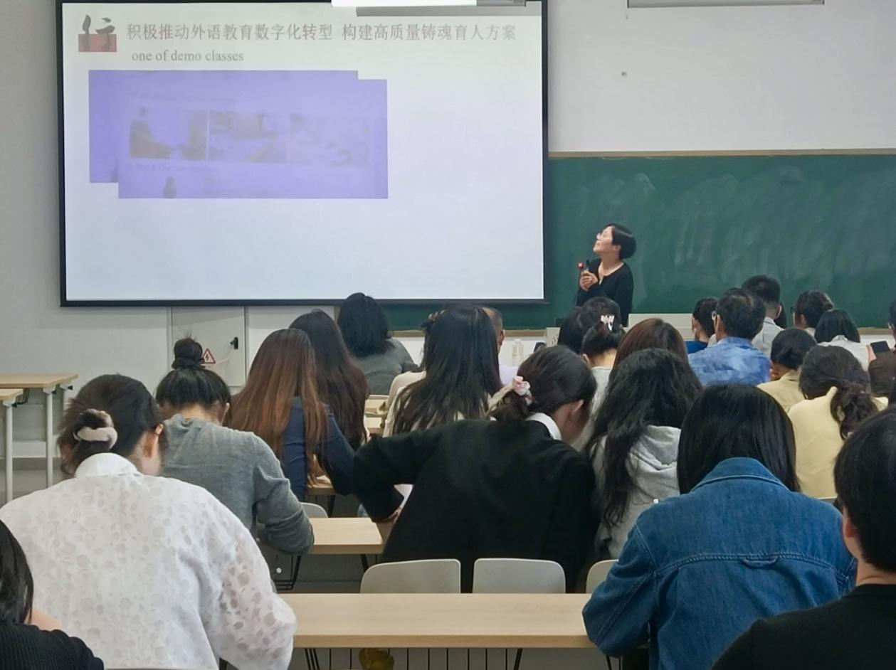 活动第二个环节——教学示范课活动。这一环节由河南省本科高校教师外语课堂教学创新大赛英语专业一等奖获得者张孟杰老师主讲。张老师以其独特的互动式教学模式,巧妙融合生动案例与趣味横生的课堂活动,不仅激发了学生的学习热情,更让在场的每一位教师见证了教学艺术的无限魅力。张老师新颖的教学方法赢得了满堂彩,成为大家竞相学习的典范。