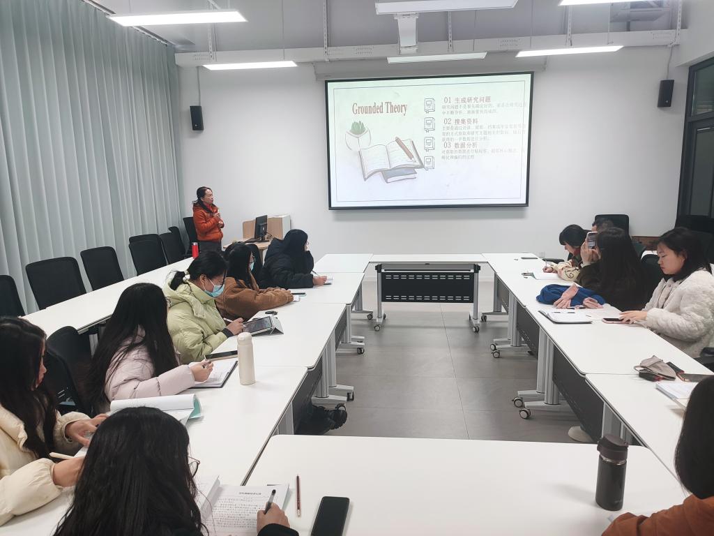 梁法丽老师从研究理论概述、研究路径的过程和步骤、研究创新和展望几个方面,结合自身教学和项目申报案例,展示了扎根理论是一种特殊的质性研究方法。讲解了在扎根理论的实际应用中,需要确定访谈对象、数据采集、三级编码、模型构建以及理论饱和度检验等。青年教师纷纷表示这场学术盛宴让自己受益匪浅,明白了扎根理论注重从原始资料中产生结论和理论,从而对社会规则、规范和意义形成解释性理解的过程,常常适用于明显具备“过程性”和“互动性”特征的某些社会现象。