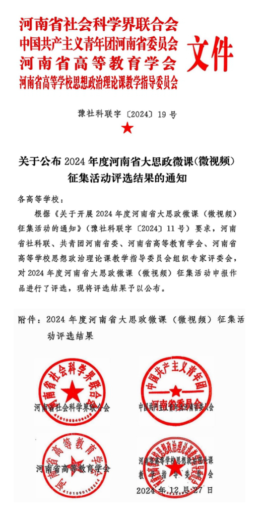 近日,由河南省社会科学界联合会、共青团河南省委、河南省高等教育学会、河南省高校思想政治理论课教学指导委员会联合举办的2024年度河南省大思政微课(微视频)征集活动评选结果公布,我校荣获课程思政微课一、二、三等奖各1项。其中,ok138cn太阳集团529李静申报的《英语话中国:首都北京》获一等奖。