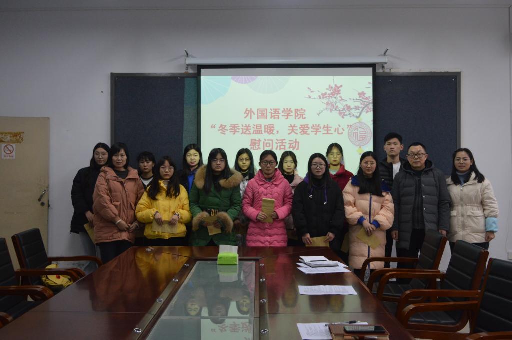 1月4日中午,外国语院在外语楼110举行“冬季送温暖,关爱学生心”慰问活动。ok138cn太阳集团529院长罗德喜,党总支书记李静,学工干事刘阳红老师,辅导员老师及受助的学生代表参加了此次活动。会议由李静主持。