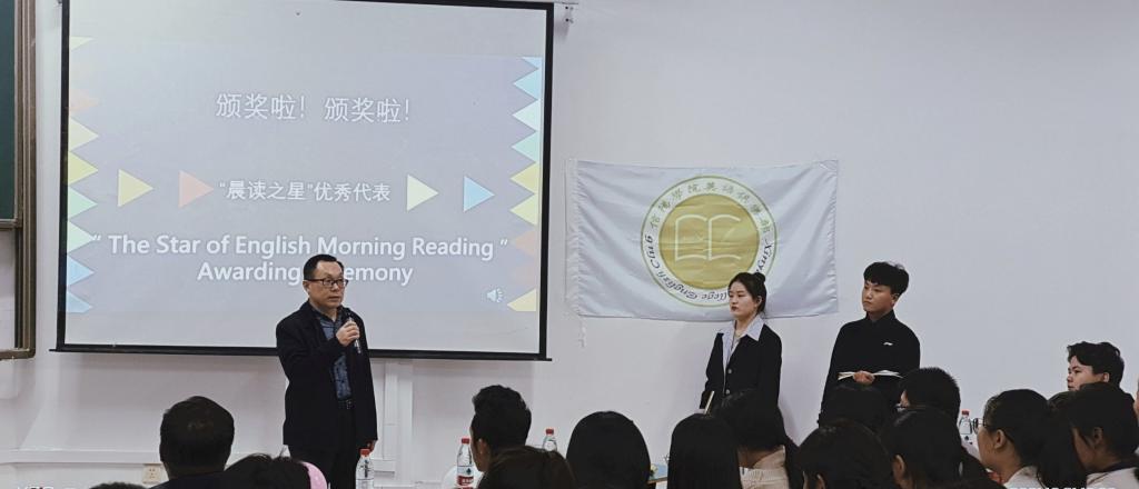 大会开始,《春晚主持秀》和《公主日记》配音秀,让全场气氛热烈起来。在热烈的掌声中,英语俱乐部会长张振基和演讲部部长潘雅静向大家介绍英语俱乐部的新阵容以及各种活动:脱口秀大会、主持人大赛、配音大赛等,通过PPT与短视频,让大家了解更多的英语俱乐部日常活动。随后,罗院长为六名优秀晨读同学颁发“晨读之星”的荣誉证书,并表达对同学们的肯定和期许。