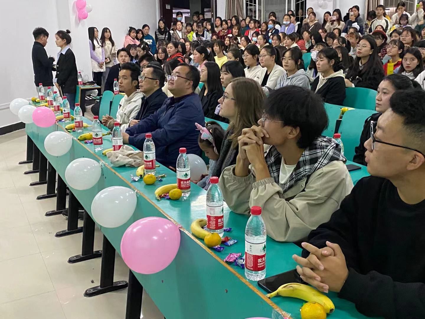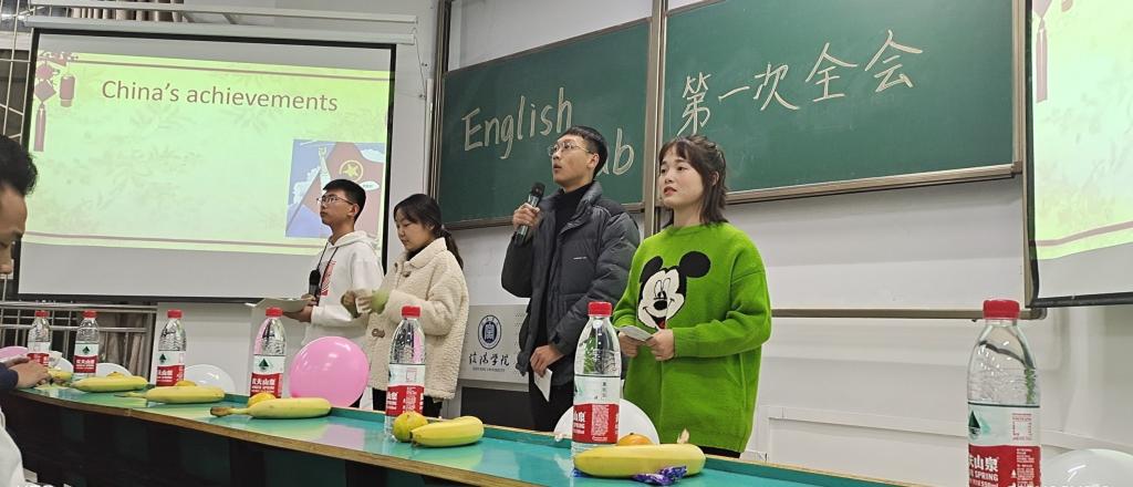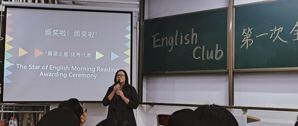 Anna老师鼓励同学们在日常生活中多多练习口语,希望同学们能够坚持下去,热爱英语,通过英语俱乐部展示自己,为自己的梦想努力。陈老师通过脱口秀的表演,为我们送上了最真诚的祝福和勉励,并模仿了印度、韩国、日本、美国、英国说英文的不同语气与方式,教室被一片欢笑声包围着,陈老师模仿的乐器也令同学们十分感兴趣。最后,主持人组在主持人的精彩发言后,此次全会落下帷幕。