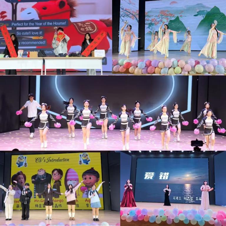 晚会现场灯光璀璨、氛围热烈,14个精心编排的节目依次亮相,涵盖歌曲、舞蹈、武术、英语配音秀、英文直播秀等多个类别。《告白气球》《至少还有你》等歌曲曲目婉转悠扬,传递青春活力与同窗温情;《大鱼》《江宁卒梦》等舞蹈舞姿灵动,融入传统文化元素,尽显东方韵味。武术表演《武展风采》动作刚劲有力,充分展现中华武学的深厚底蕴;英语配音秀《神偷奶爸》、英文直播秀则紧扣学院学科特色,将语言学习与趣味表演相结合,凸显专业优势。动漫秀与手语表演的跨界融合、爵士舞《Whiplash》的激情演绎,为现场观众呈现了一场兼具观赏性与感染力的视听盛宴,赢得阵阵掌声。