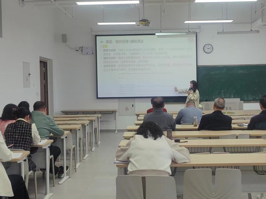 张老师围绕四大核心维度层层展开:从理论解读锚定立德树人根本任务,到课程筑基立足英语专业复合型人才培养目标;从课堂实践打造中西文明互鉴教学场景,到未来展望探索AI赋能课程思政新形式,系统勾勒外语专业课程思政与专业教学深度融合的实施路径。张金梅老师结合微助教平台现场讲解混合式教学闭环搭建,并以“人文主义”单元为例,演示中西文明对比的教学实操。此次课程思政实践有效解决了西方文明教材“西方中心”叙事倾向、学生跨文化比较视角薄弱等问题,让学生在中西对话中明晰文化主体性,筑牢民族认同感,同时显著提升了学生用英语讲好中国故事的国际表达能力,实现了知识传授与价值引领的有机统一。张金梅老师强调,课程思政融入并非简单“贴标签”,核心是通过“视角转换”构建中国参照系,培养学生不仰视、不俯视的“平视”视野,让思政育人真正入脑入心。此次分享不仅是课程思政实践经验的交流,更是教育理念的深化,推动外语专业课程思政建设走深走实。