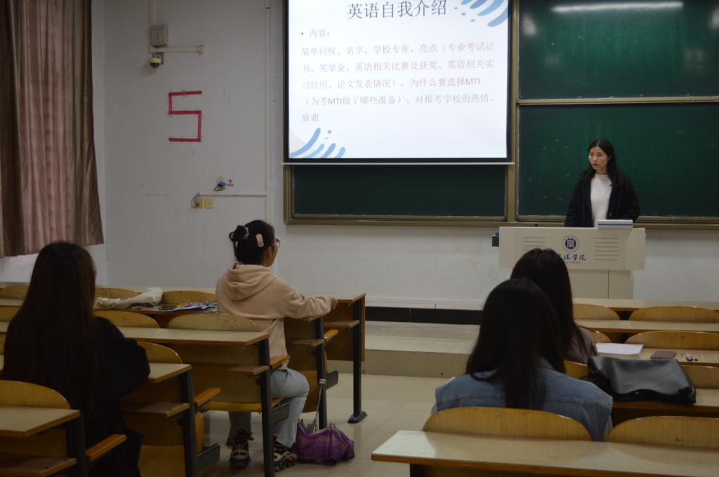 刘肖燕老师结合自身考研及复试经验,向同学们分享了如何报考MTI专业研究生以及复试注意事项。讲座主要针对报考MTI专业研究生的同学以及有意向报考上海地区学校的学生,从“MTI是什么”“MTI考什么”“MTI学什么”“MTI就业情况”“上海地区高校选择”5个部分展开介绍。提供了复试自我介绍的英语口语模拟意事项,并让现场学生进行自我介绍展示,随后给予点评和指导。