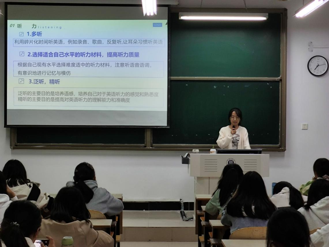 慕雨欣同学向同学们强调打好基础,紧抓“听,说,读,写”的重要性。尤其是在听力方面,雨欣学姐寄语同学们要扩大词汇量,扎牢听力能力,使英语真正成为你生活中的语言,而不是生硬的题海。