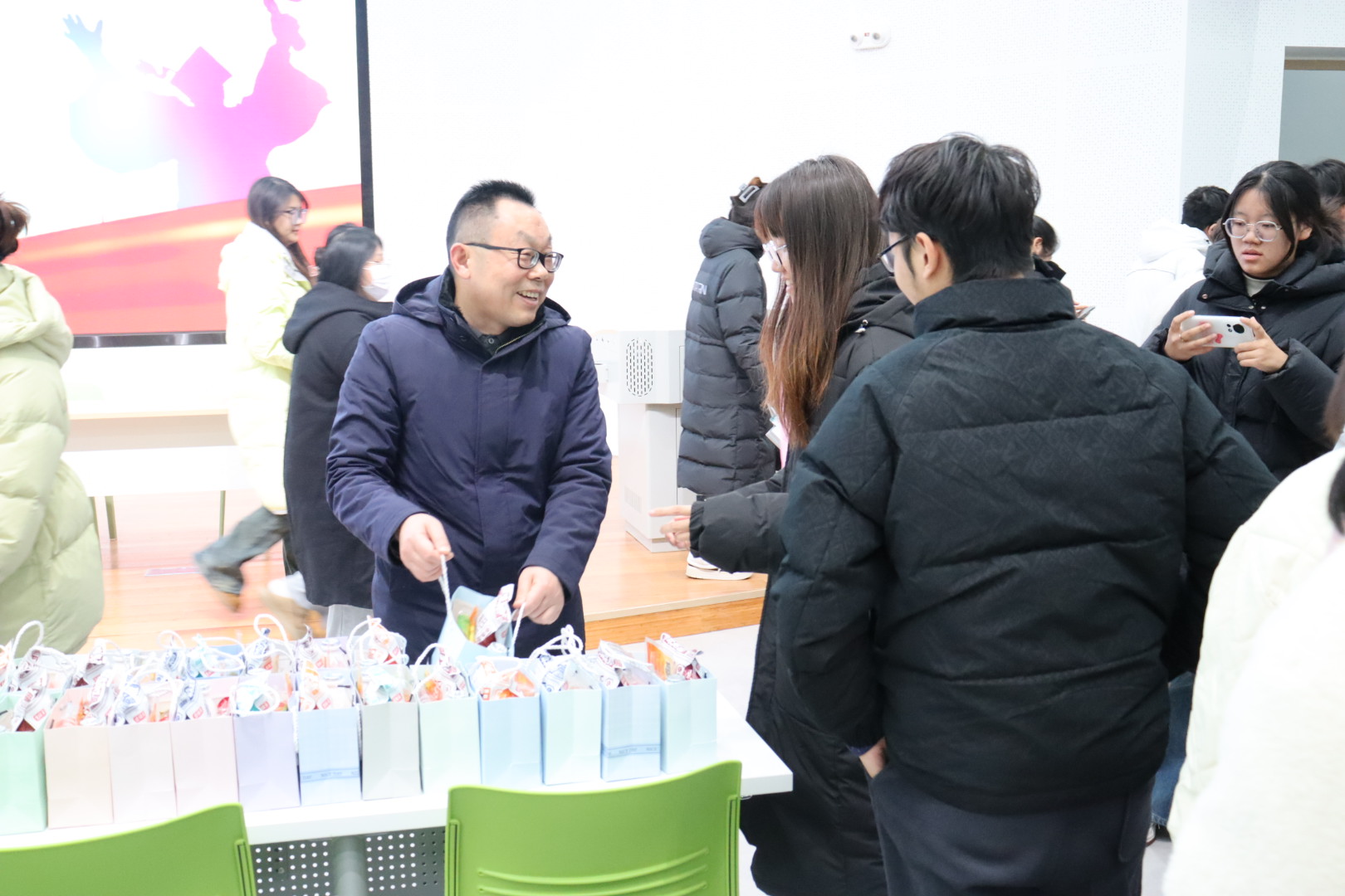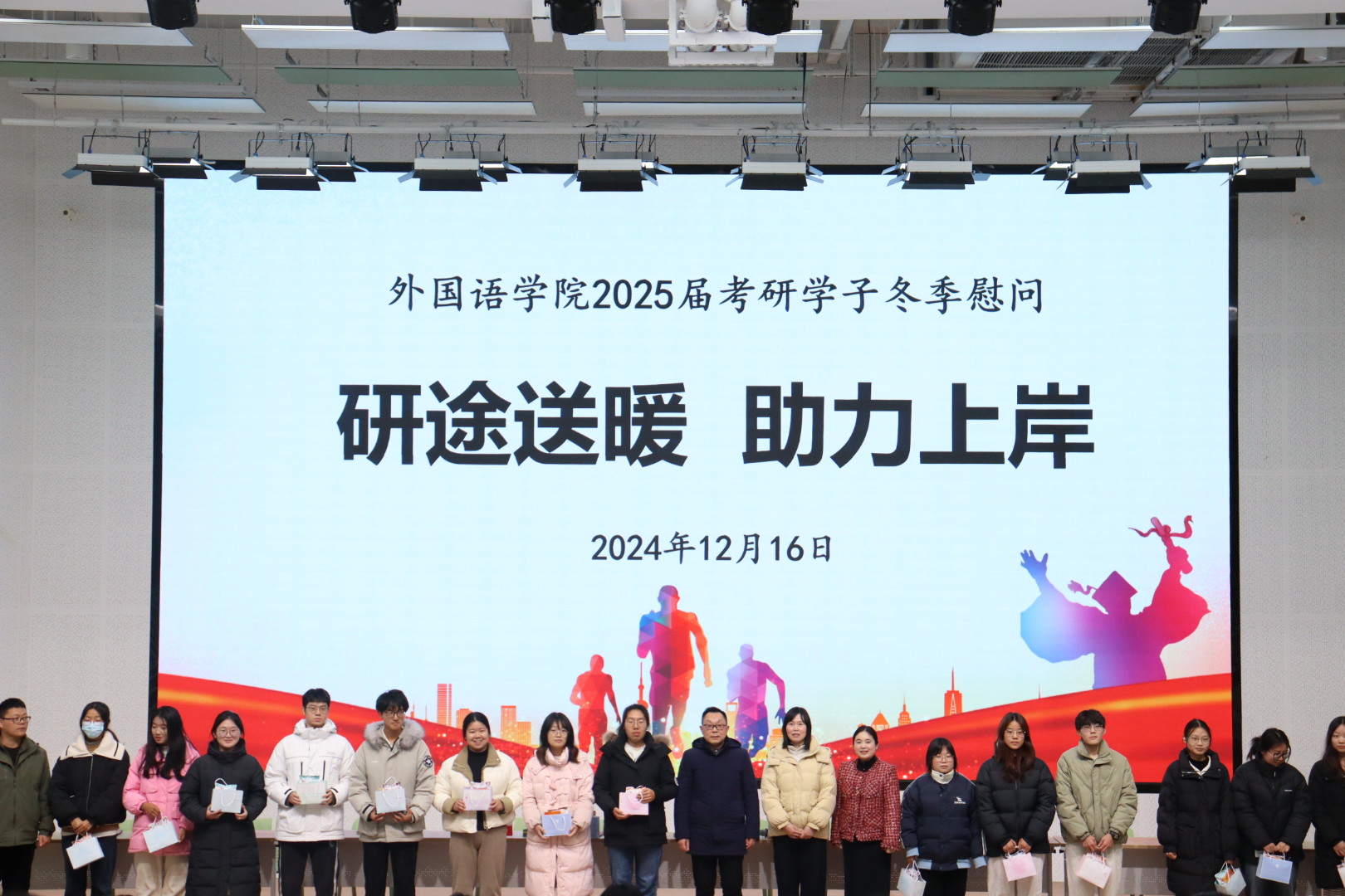 活动尾声,老师们为考研学子送上精心准备的考研“加油包”,每个礼包内装满了各类能量零食,寓意在接下来的日子里,同学们能够能量满满、无“食”不刻保持最佳状态。老师们也为同学们送上真挚祝福,殷切叮嘱大家劳逸结合,保持良好的心态和作息规律,以最佳的状态迎接考试。