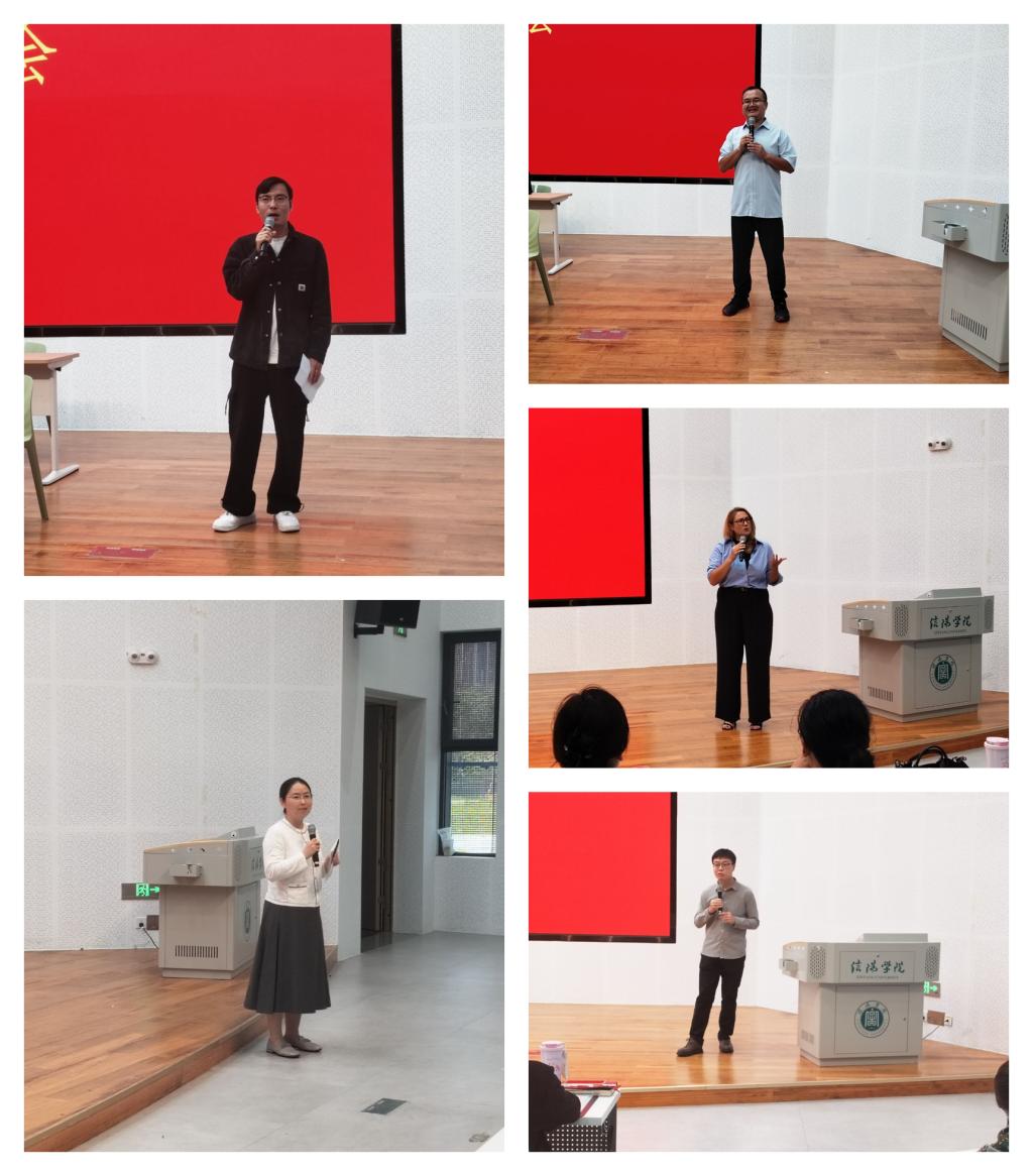 随后,最受欢迎教师代表Anna、陈俊明、余兰、易威伟、沈炳坤依次登台,以“师生对话”形式与新生互动交流。Anna 老师结合跨文化交际课程案例,用“语言小故事 + 文化差异分析”的方式,引导新生理解外语学习的文化内涵;陈俊明老师聚焦于提升口语表达能力,指出 “日常对话模拟训练”“发音纠错技巧” 等是口语提升的有效路径。余兰、易威伟、沈炳坤三位老师则分别从考研、专业发展、外语教学等方向,结合自身科研与教学经历,传递“以兴趣为导向、以实践为支撑”的学习理念。老师们幽默生动的表达、贴近新生需求的分享,不仅展现了我院教师扎实的专业素养,更营造出温暖亲切的育人氛围,让新生深切感受到学院的教学温度与学术活力。