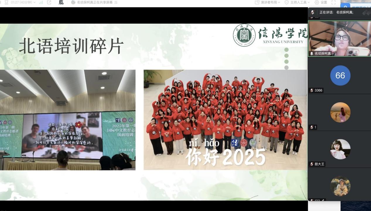 随后,2025年赴泰国国际中文教育志愿者们依次用精心制作的PPT,全面介绍了2025年项目选派计划、岗位设置、申报条件、报名时间安排、选拔考核流程(含笔试、面试及心理测评)、岗前培训方案等关键信息,并详细说明志愿者在海外服务期间的权利义务与待遇保障政策。同时,志愿者们结合自身经历,生动分享了海外教学工作、日常生活适应及个人成长收获等内容,帮助与会同学对志愿者工作与生活形成直观且深刻的认知。