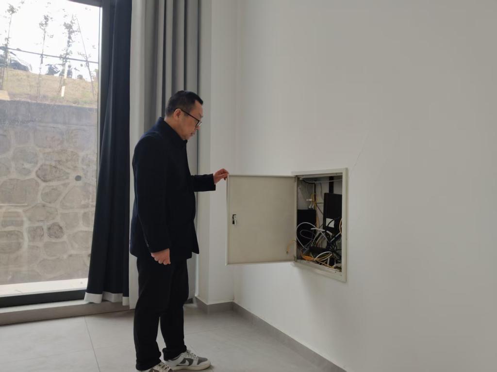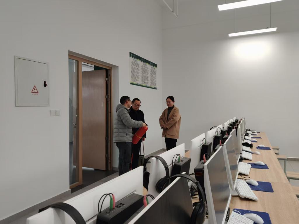 检查组严格对照实验室安全管理规范重点围绕用电消防安全、数字设备运行、网络数据安全、实训终端完好四大核心板块逐项细致查验,并一一检测教室控制台、学生终端耳机麦克风硬件完好度、系统登录认证流程情况,实验室管理员详细汇报了实验日志的登记及实验室准入情况。罗德喜强调:“实验室是学院外语教学与人才培养的核心阵地,安全是教学实训的前提底线,必须以‘时时放心不下’的责任感抓实抓细每一项安全工作。” 检查过程中,罗德喜、程娇炎仔细查看总配电柜线路、弱电交换机运行状态及多机位插排老化情况,逐一核对灭火器压力数值、应急照明设备有效性及疏散通道畅通情况,反复叮嘱管理员务必做好设备日常巡检与维护记录。