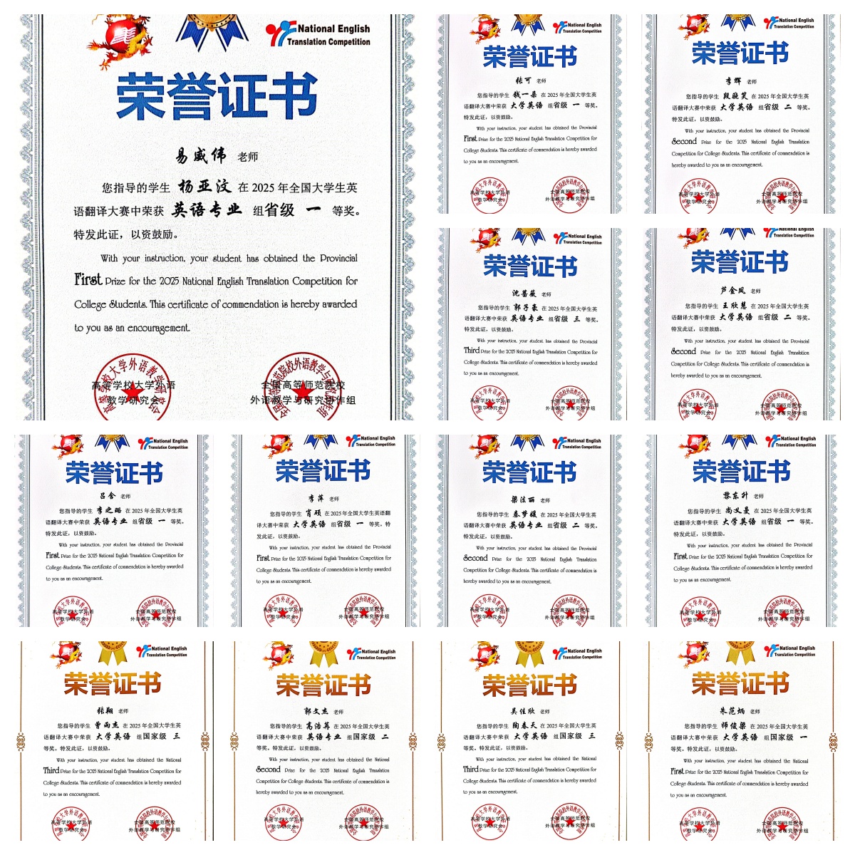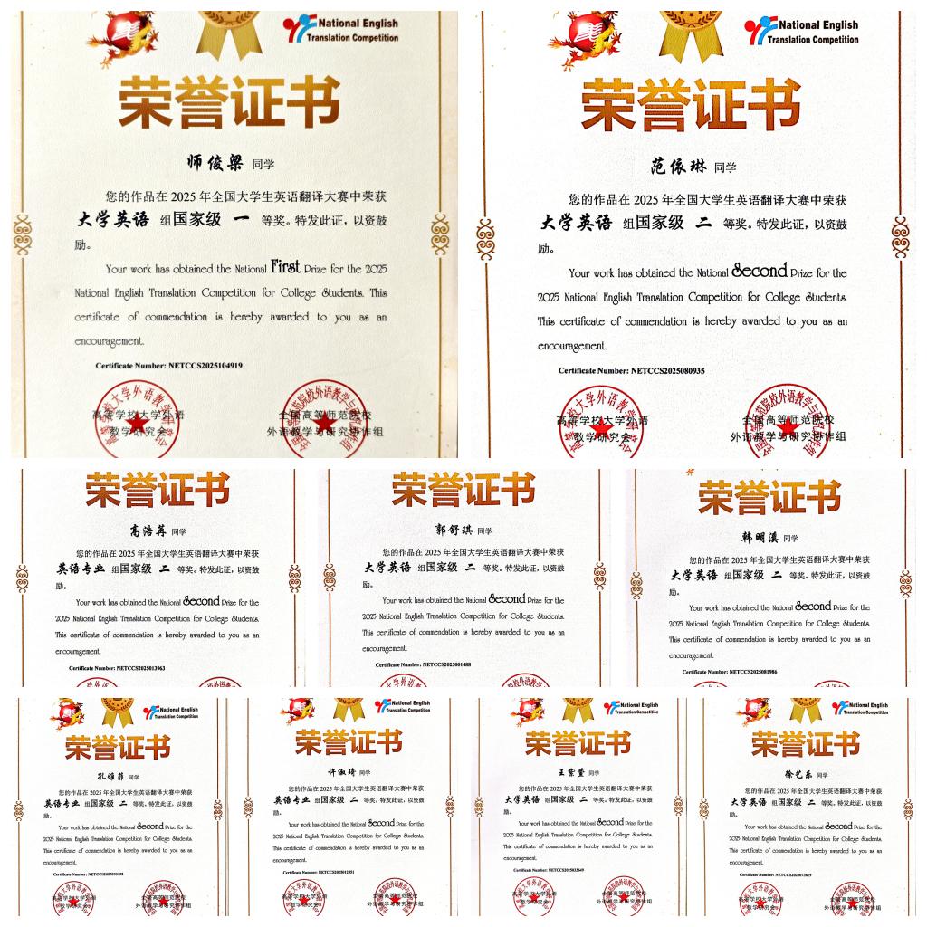近日,2025年全国大学英语翻译大赛(NETCCS)获奖名单正式揭晓,太阳集团学子凭借卓越的双语转换能力、深厚的文化素养与创新表达思维,在全国3000余所高校、近30万名参赛者中崭露头角,一举斩获各级奖项40项,其中国家一等奖1项,实现我校在该项赛事国家级最高奖项上的“零的突破”,创历史最佳成绩。
