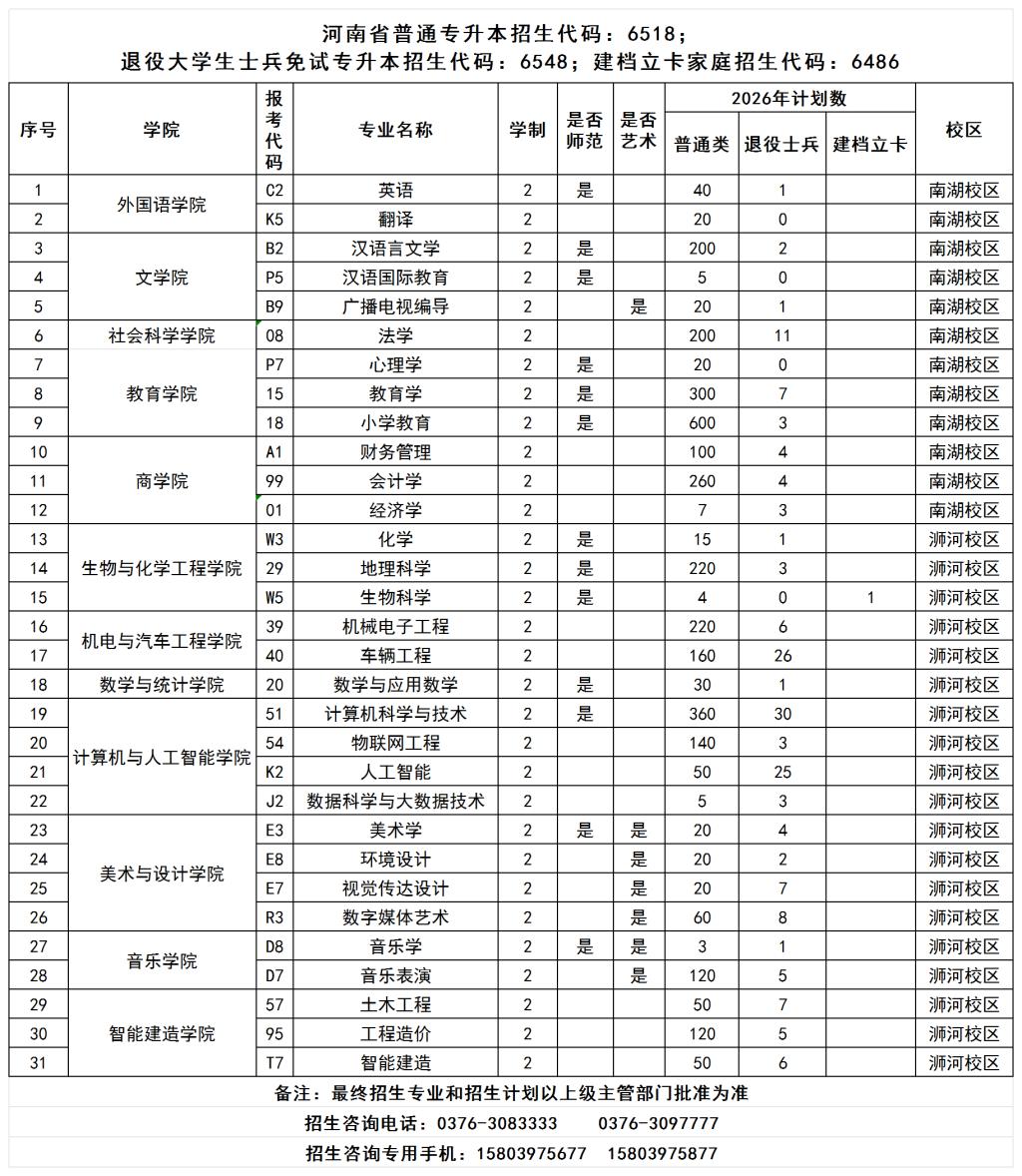 太阳集团2026年专升本招生计划