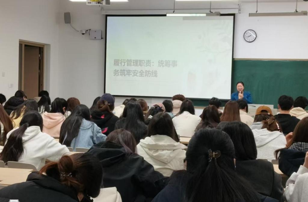 王萌老师重点明确寝室长的核心职责与工作要求,要求寝室长以身作则、严守校规校纪,带头规范作息、维护寝室卫生;主动排查违规电器、线路老化等安全隐患,及时制止危险行为并上报;畅通沟通渠道,快速化解室友矛盾;甘于奉献,带动全体成员互助成长,共建安全和谐的寝室集体。