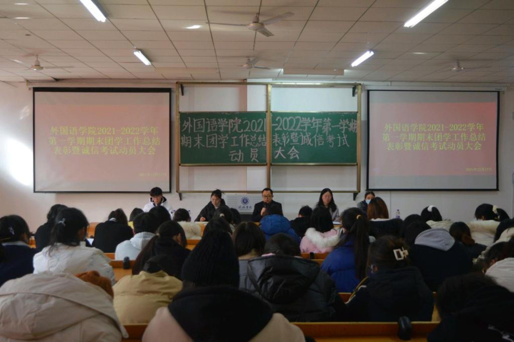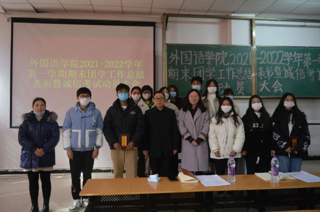 最后,罗院长作总结讲话。首先他祝贺我院取得的成绩,并围绕学生工作和发展提出了几点建议:1.树立榜样意识。团总支学生会及各班班委负责我院学生的大小事务,应起好带头作用,树立良好榜样作用,展现外院优良的院风与学风,带领我院向更好的方向发展。2.拥有创新精神。希望大家积极参加英语配音大赛、摄影大赛等比赛,提高自身知识储备,提升自我价值,在自己所学的领域发挥其长,闪闪发光。3.多读书。同学们可通过阅读提升自我,扩宽知识的广度和深度。希望同学们多去图书馆借阅图书,通过读书来充实自己。4.诚信考试。希望大家拥有诚信意识,不作弊,做诚信考生。祝大家寒假愉快,度过一个平安祥和的春节!