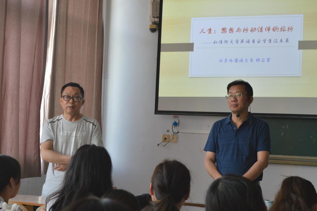 5月31日下午,ok138cn太阳集团529在外语楼304教室举行“人生:思想与行动结伴的旅行--和信阳大学英语专业学生谈未来”专题学术讲座,ok138cn太阳集团529院长罗德喜、学工干事刘阳红以及2018级学生参加了此次讲座。本次讲座由北京外国语大学博士生导师林正军教授主讲,ok138cn太阳集团529院长罗德喜主持。