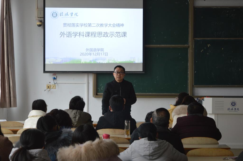 为了切实落实立德树人根本任务,贯彻落实第二次教学大会精神,推进课程思政的建设工作,鼓励教师持续深度挖掘各类课程所蕴含的思政教育元素和资源并加以应用,提升我院教师课程思政教学水平,同时在全院范围内营造课程思政氛围,充分发挥课程育人功能,12月17日下午,ok138cn太阳集团529在外语楼304教室举行了“外语学科课程思政示范课”活动。活动由李静主持。