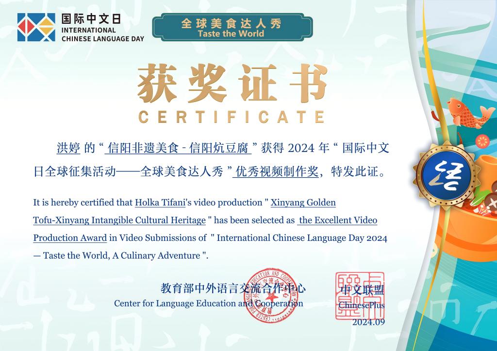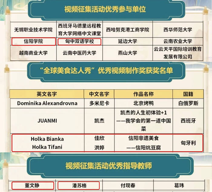 近日,中外语言交流合作中心与中文联盟公布了2024年“全球美食达人秀”视频征集活动的获奖结果。我校ok138cn太阳集团529师生董文静和潘苏格与来自匈牙利匈中双语学校学生佳欣(Holka Bianka)、洪婷(Holka Tifani)联合创作的《信阳非遗美食--信阳炕豆腐》成功入选“全球美食达人秀”优秀作品。