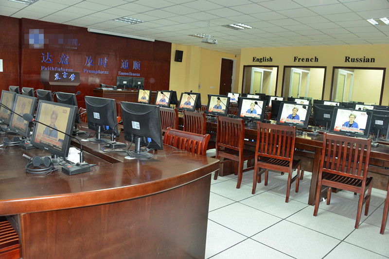 该实验室主要为学生提供翻译口译、同声传译的综合实验,集同传会议、语言翻译教学、可视化交互式语言教学多平台位一体,具备翻译教学、同传训练、国际同声传译会议系统和辅助教学管理等功能。该系统积累了外语一线教学专家,并拥有多年的教学经验、根据当前翻译教学的实际情况,设计并嵌入了许多先进的教学模式,包括基础口译教学、交传技能教学、同传技能教学、交传专题教学、同传专题教学、英汉口译教学、汉英口译教学、口译观摩、口译实战、模拟交传会议、模拟同传会议、笔译教学等多种教学模式,并提供短期记忆、口译笔记、影子训练、听辩理解、原语概述、视译训练、小组讨论等多种训练模式。